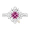 Sự kết hợp giữa sapphire hồng và các cụm kim cương bao quanh tạo hiệu ứng ánh sáng đa tầng rõ ràng. Màu hồng trung tâm nổi bật trên nền kim cương trắng, giúp phân tách lớp thị giác mạch lạc. Khi thay đổi góc nhìn, ánh sáng phản chiếu qua từng cánh hoa và dọc thân nhẫn, làm nổi bật cấu trúc xếp lớp đặc trưng của thiết kế.