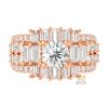 Bao quanh viên kim cương trung tâm là cụm kim cương baguette kết hợp kim cương tròn, được sắp xếp đối xứng thành nhiều tầng halo. Các tầng kim cương được phân bổ hợp lý, tạo chiều sâu rõ ràng cho mặt nhẫn. Sự kết hợp giữa hai kiểu cắt giúp mặt nhẫn có cấu trúc rõ ràng, các chi tiết liên kết chặt chẽ và không gây cảm giác rối.
