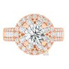 Vòng kim cương tròn nhỏ xếp liên tục bao quanh viên đá trung tâm trên nhẫn vàng hồng Au750.