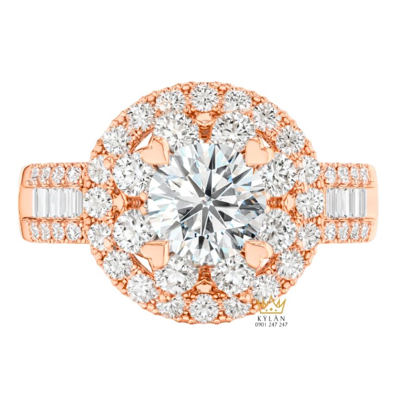 Nhẫn nữ này được thiết kế với thân dạng tròn và phần vai tách nhẹ thành hai nhánh khi tiến gần mặt nhẫn. Bề mặt kim loại được làm nhẵn, các cạnh bo mềm tạo sự chuyển tiếp giữa thân và phần mặt. Khu vực trung tâm được nâng cao, hình thành bố cục rõ giữa viên kim cương chính, vòng đá bao quanh và phần thân nhẫn phía dưới.