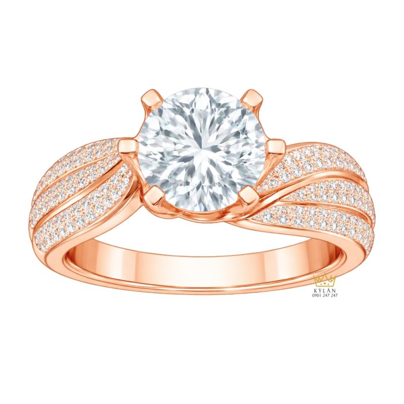 Nhẫn nữ vàng hồng Au750 đính kim cương được làm từ vàng hồng Au750 với bề mặt kim loại nhẵn, độ bóng ổn định và màu sắc đồng đều. Thân nhẫn có độ dày vừa phải, tạo kết cấu rõ giữa phần mặt và đai phía dưới. Tổng thể thiết kế theo trục đối xứng, trong đó khu vực trung tâm và hai bên vai được liên kết liền mạch, hình thành bố cục cân đối khi nhìn trực diện.