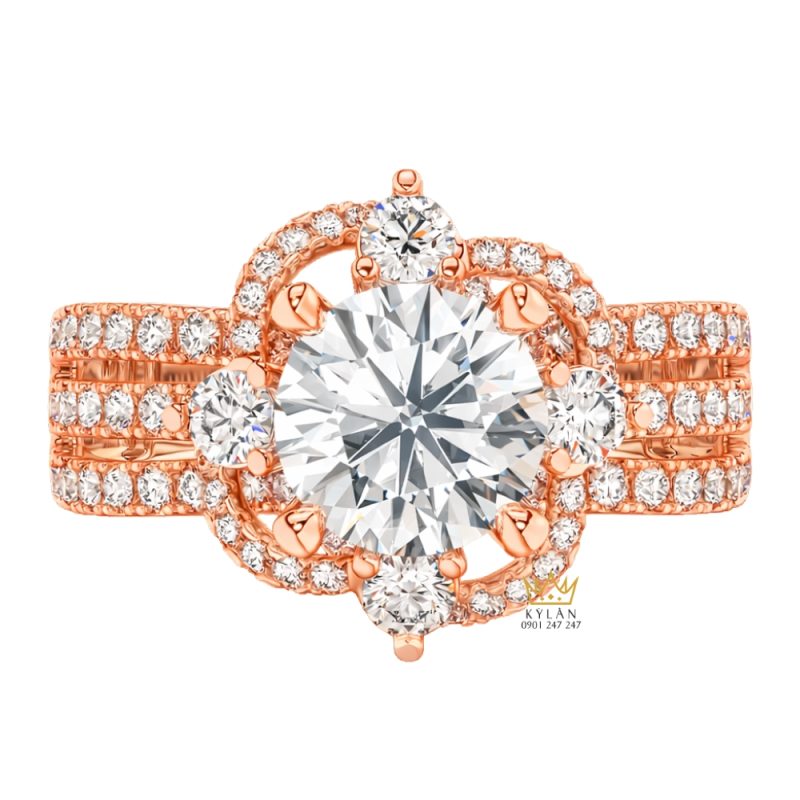 Bao quanh viên trung tâm là vòng halo gồm các viên kim cương nhỏ xếp liên tục theo đường tròn. Các viên có kích thước tương đồng, được đính sát nhau trong rãnh kim loại, tạo bề mặt liền mạch. Các lớp đá phụ được bố trí đối xứng hai bên, giữ sự cân bằng thị giác. Hệ chấu nhỏ giữ đá gọn, không làm gián đoạn đường viền, giúp tổng thể rõ ràng khi nhìn từ trên.