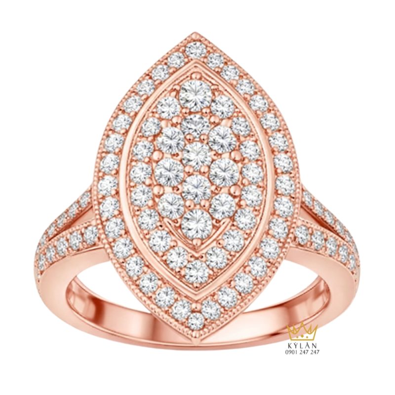 Nhẫn nữ vàng hồng Au750 dáng marquise kéo dài, cụm kim cương trung tâm nhiều lớp, viền đá theo biên dạng hình thoi, bố cục đối xứng và bề mặt liền mạch.