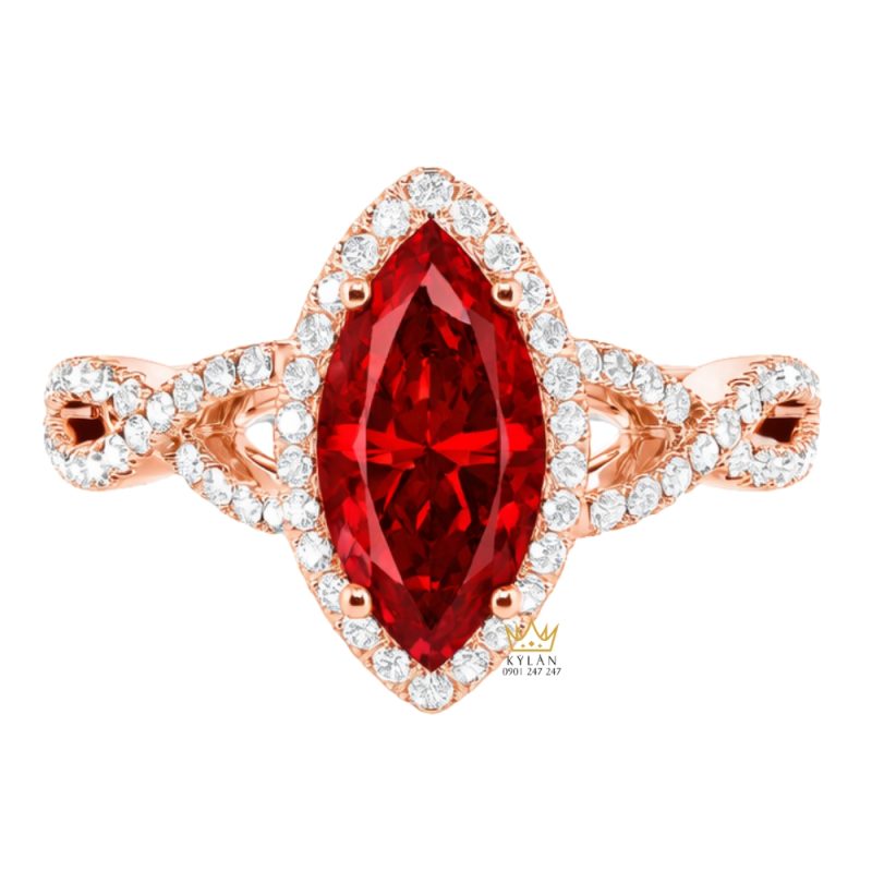 Sapphire đỏ dáng marquise trung tâm được giữ bằng 4 chấu nhỏ hai đầu và hai bên, ôm sát viên đá, bố cục cân đối, lộ rõ mặt cắt và tách biệt với viền kim cương.