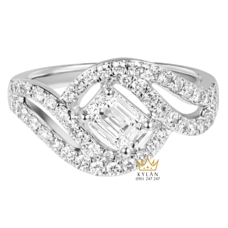 Điểm nhấn trung tâm của chiếc nhẫn là viên kim cương dáng emerald được đặt nổi bật ở phần đầu nhẫn. Kiểu cắt emerald mang đến bề mặt phẳng, các đường cắt rõ ràng, giúp ánh sáng phản chiếu đều và sắc nét. Viên chủ được cố định chắc chắn bằng hệ chấu tinh xảo, đảm bảo sự ổn định trong quá trình sử dụng hằng ngày mà vẫn giữ được tính thẩm mỹ cao.