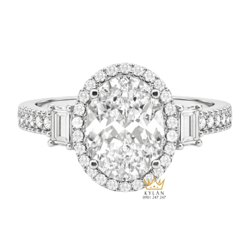 Vòng halo giúp tăng chiều sâu cho mặt nhẫn, đồng thời tạo sự chuyển tiếp nhẹ nhàng giữa viên chủ và phần thân. Bố cục này làm nổi bật hình dáng oval mà vẫn giữ được sự cân đối giữa các chi tiết.