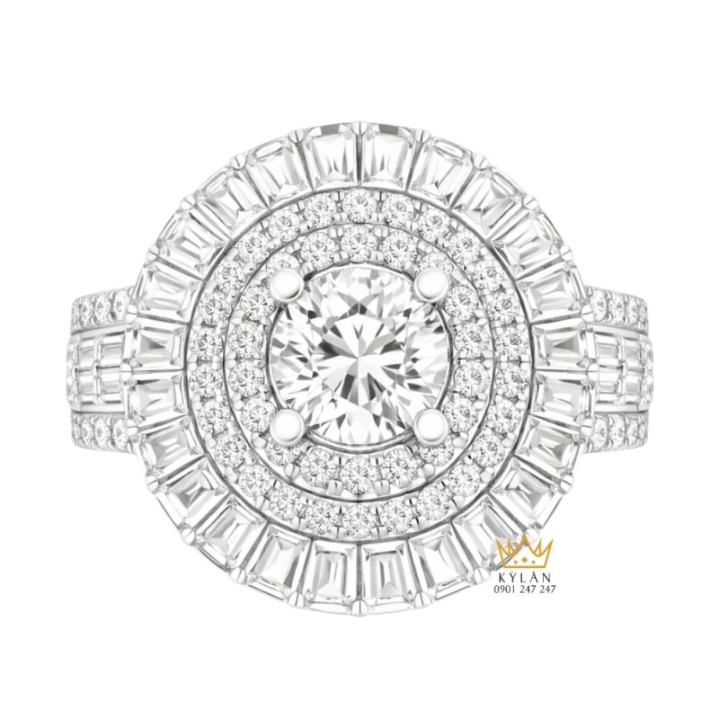 Thiết kế sử dụng đồng thời kim cương baguette và kim cương tròn để tạo nhịp điệu bề mặt. Các viên baguette được đặt theo trục thẳng, xen kẽ kim cương tròn nhỏ nhằm tăng độ chuyển tiếp giữa các lớp viền. Sự kết hợp hai kiểu cắt mang lại hiệu ứng phản xạ đa hướng, giúp mặt nhẫn thay đổi sắc độ ánh sáng khi cử động tay.