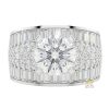 Nhẫn được thiết kế với bản dày ở phần mặt và thu gọn dần về phía dưới, tạo cấu trúc rõ giữa khu vực trung tâm và thân nhẫn. Bề mặt kim loại được hoàn thiện trơn, các cạnh bo nhẹ tạo sự chuyển tiếp giữa các phần. Phần mặt nhẫn được nâng cao, hình thành cụm đá trung tâm và các lớp kim cương bao quanh theo bố cục dạng oval.