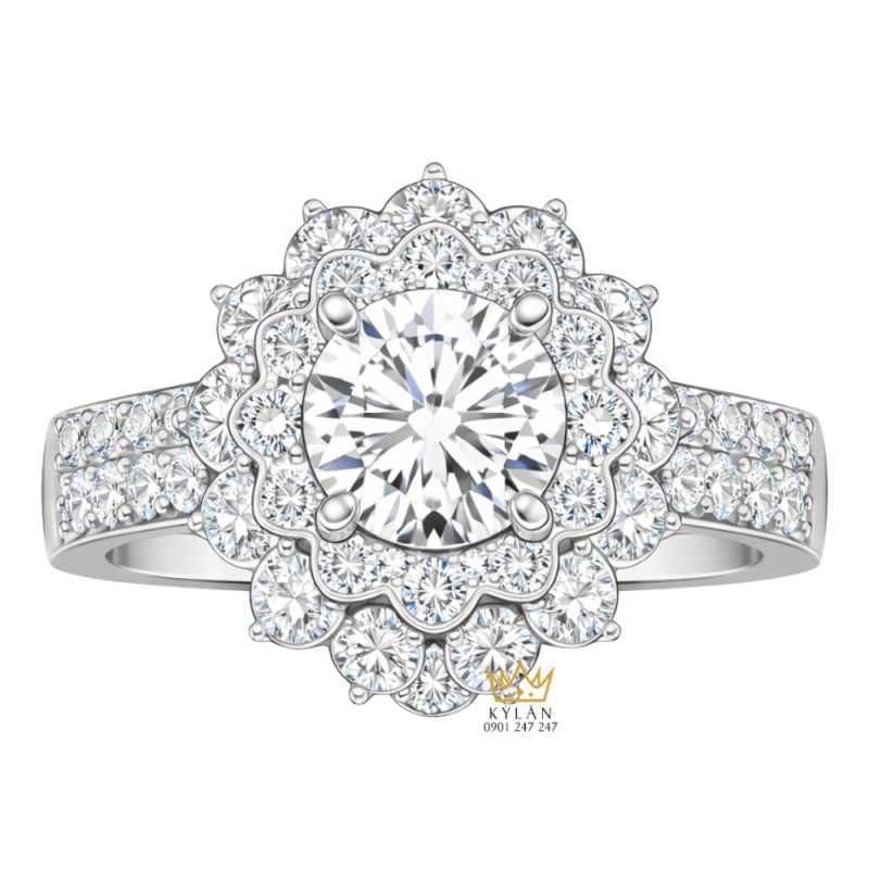 Nhẫn nữ được thiết kế với thân bản vừa, bề mặt kim loại đánh bóng và lòng trong hoàn thiện trơn. Phần mặt được nâng cao so với thân, tạo khu vực trung tâm rõ ràng cho viên kim cương chính và các lớp đá bao quanh. Bố cục tổng thể theo trục đối xứng, liên kết liền mạch giữa mặt nhẫn và hai bên vai.