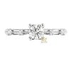 Mặt nhẫn được giữ gọn với viên kim cương tròn đặt tại trung tâm, các chi tiết xung quanh được tối giản để tập trung vào trục chính. Tỷ lệ giữa viên đá và thân được cân chỉnh hợp lý, giúp tổng thể không bị lệch khi nhìn trực diện. Các đường viền được xử lý mượt, các điểm nối kín, tạo bề mặt liền mạch. Bố cục đối xứng giúp hình khối rõ ràng và dễ quan sát từ nhiều góc.