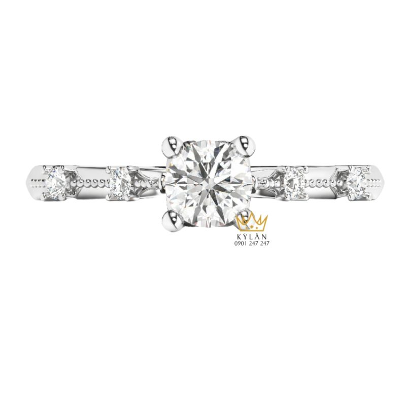 Viên kim cương chủ được đặt trên hệ 4 chấu cao, bố trí đều quanh viền và nâng lên khỏi bề mặt thân. Các chấu ôm sát viên đá, giữ cố định vị trí mà không che nhiều diện tích. Khoảng cách giữa các chấu được kiểm soát đồng đều, giúp viên đá nằm đúng trục. Phần nâng tạo khoảng hở bên dưới, giúp ánh sáng đi qua từ nhiều hướng và làm rõ bề mặt khi nhìn gần.
