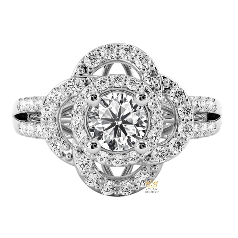 Mặt nhẫn được phát triển theo cấu trúc nhiều lớp xoay quanh viên kim cương tròn trung tâm, tạo trục chính rõ khi nhìn trực diện. Các lớp bao quanh uốn cong theo dạng xoắn, phân bổ đều và giữ khoảng cách ổn định, không chồng kín. Bề mặt xử lý mượt, các điểm nối kín, giúp tổng thể liền mạch và hình khối phân tách rõ giữa trung tâm và các vòng halo.