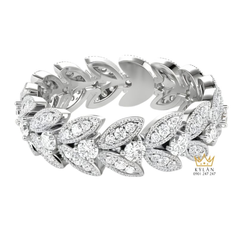 Điểm nhấn nổi bật của mẫu nhẫn nằm ở sự kết hợp hài hòa giữa các cụm kim cương dáng lá (marquise) và kim cương tròn được sắp xếp xen kẽ quanh thân nhẫn. Kim cương dáng marquise với hình dáng thon dài tạo hiệu ứng kéo dài ngón tay, mang lại cảm giác thanh mảnh và duyên dáng. Trong khi đó, kim cương tròn giúp cân bằng bố cục, tăng sự mềm mại và hài hòa cho tổng thể thiết kế.