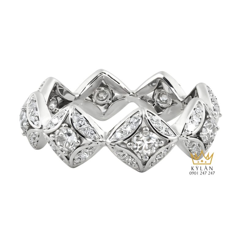 Mỗi ô họa tiết đều được đính một viên kim cương tròn ở vị trí trung tâm. Viên đá được đặt gọn trong khung, tạo điểm nhấn rõ nét cho từng mô-đun thiết kế. Việc lặp lại chi tiết kim cương trung tâm giúp tổng thể chiếc nhẫn có sự đồng nhất, không bị rời rạc hay mất cân đối.