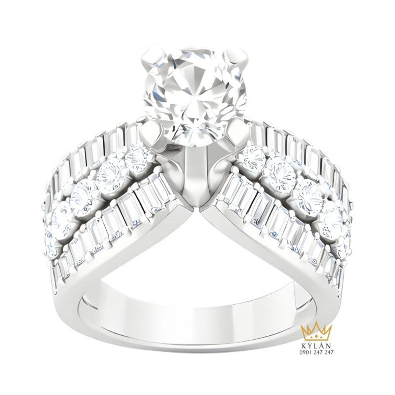 Hai bên thân nhẫn được đính kết kết hợp giữa kim cương tròn và kim cương baguette xếp song song. Cách phối này tạo nên chiều sâu rõ ràng cho thân nhẫn, đồng thời giúp ánh sáng phản xạ đều dọc theo trục nhẫn. Các viên kim cương được đính thẳng hàng, khoảng cách hợp lý, giữ cho tổng thể luôn gọn gàng và liền mạch.