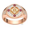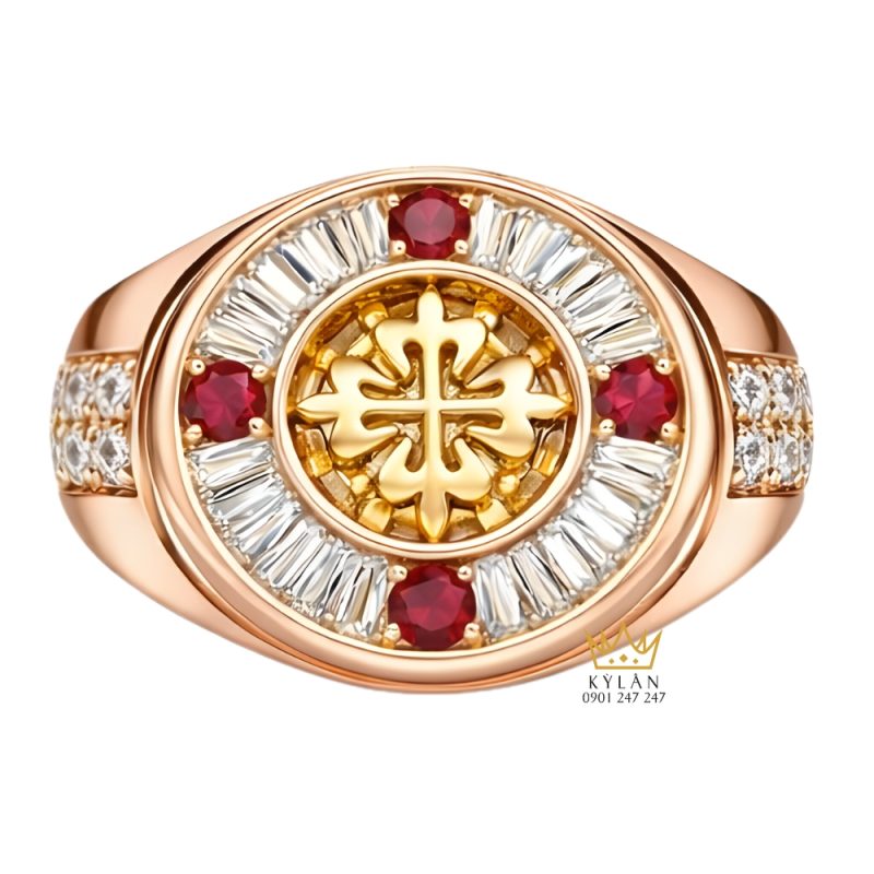 Nhẫn Patek Philippe này được chế tác từ vàng hồng Au750, kết hợp hoàn hảo với kim cương và đá ruby, tạo nên một thiết kế vô cùng sang trọng và tinh tế. Trung tâm của chiếc nhẫn là một vòng tròn với các viên ruby đỏ rực rỡ, làm nổi bật sự quyến rũ và lôi cuốn của chiếc nhẫn. Đá ruby, vốn được biết đến với ý nghĩa tình yêu và đam mê, mang lại vẻ đẹp mạnh mẽ và nổi bật cho sản phẩm.