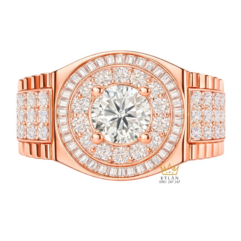 Chiếc nhẫn rolex được thiết kế với mặt tròn lớn đặt tại vị trí trung tâm. Viên kim cương tròn được đặt ở giữa và cố định bằng hệ thống bốn chấu kim loại cân đối. Phần ổ đá được nâng cao so với bề mặt thân nhẫn, tạo khoảng hở phía dưới viên đá. Cách bố trí này giúp viên kim cương nằm rõ ở trung tâm của mặt nhẫn và tạo độ tách biệt giữa viên chủ với phần khung kim loại xung quanh.