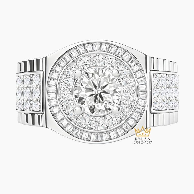 Nhẫn Rolex vàng trắng Au750 đính kim cương được thiết kế với trọng tâm đặt vào cấu trúc mặt nhẫn, tỷ lệ bản và mức độ hoàn thiện chi tiết. Tổng thể chiếc nhẫn sở hữu dáng mặt tròn bản lớn, lấy cảm hứng từ hình khối vỏ đồng hồ Rolex. Bề mặt kim loại được xử lý sáng mịn, các chi tiết được liên kết liền mạch, tạo cảm giác gọn gàng và rõ ràng khi quan sát.