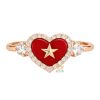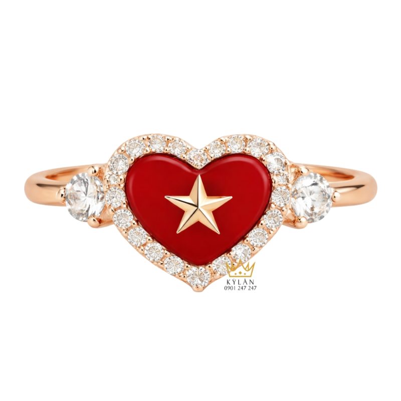 Nhẫn trái tim đính ngôi sao vàng hồng Au750 với mặt nền đỏ, ngôi sao vàng nổi tại trung tâm. Viền kim cương tấm bao quanh tạo khung rõ, hai bên thân gắn kim cương tròn đối xứng. Đai nhẫn bản mảnh đánh bóng, lòng trong trơn, các chi tiết liên kết liền mạch giữ cấu trúc ổn định khi đeo.