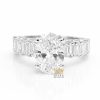 Hai bên thân nhẫn được đính kim cương baguette sắp xếp thẳng hàng, tạo cảm giác liền mạch và đều đặn. Các viên baguette có kích thước đồng đều, được gắn sát nhau, giúp bề mặt thân nhẫn phẳng, gọn và có chiều sâu thị giác. Kiểu sắp xếp này làm nổi bật phần mặt nhẫn trung tâm mà vẫn giữ sự đồng bộ trong thiết kế tổng thể.