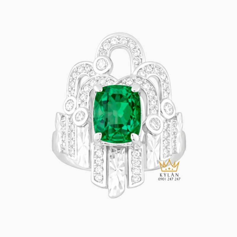 Tâm điểm của thiết kế là viên ngọc lục bảo xanh lục được cắt theo dáng cushion. Các cạnh bo tròn kết hợp mặt cắt rõ ràng giúp viên đá có hình khối cân đối và độ sâu tốt. Màu xanh lục thể hiện sắc độ ổn định, bề mặt trong và đều màu. Viên đá được đặt tại vị trí trung tâm mặt nhẫn, cố định chắc chắn và cân xứng theo trục thiết kế, giúp tổng thể không bị lệch khi sử dụng.