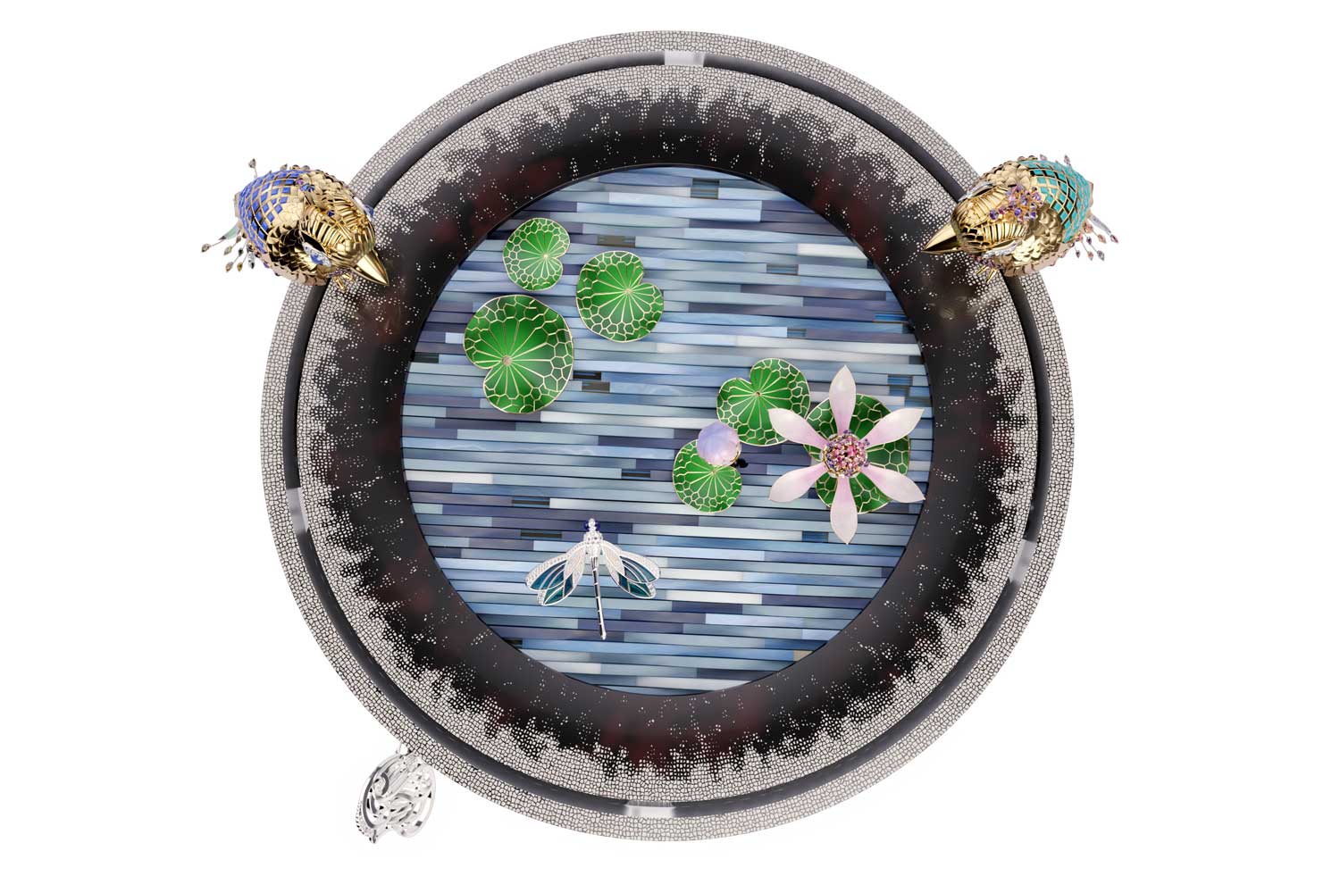 Với khung cảnh khu vườn quyến rũ và hoàn toàn tuyệt vời có hình ảnh hai con chim vàng ngồi bên cạnh đài phun nước do François Junod tạo ra. Những con chim được chế tác bởi một loạt các viên ngọc bích, ngọc hồng lựu, kim cương rực rỡ. Đây là một màn trình diễn thủ công và nghệ thuật tuyệt vời, mặc dù nó cũng phục vụ mục đích chức năng – có một màn hình hiển thị thời gian ngược ở chân đài phun và cơ chế có khả năng dự trữ năng lượng trong tám ngày.