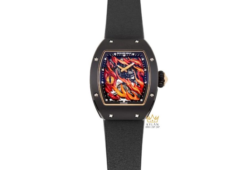 Richard Mille tiếp tục theo đuổi triết lý biến mặt số thành một sân khấu nghệ thuật thu nhỏ. Với RM 26-02, thương hiệu hợp tác cùng nghệ sĩ Olivier Vaucher tại Geneva, người chịu trách nhiệm tạo hình con mắt và hệ thống ngọn lửa.