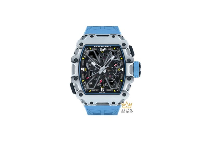 Richard Mille những năm gần đây cho thấy sự tiến bộ rõ rệt trong việc phối màu. Trên RM 35-03, các gam trắng – đen – đỏ – vàng được cân bằng tốt, trong khi màu xanh nhạt của dây, vòng cao su quanh núm và gioăng dưới kính sapphire tạo điểm nhấn thị giác thú vị mà không gây rối mắt.