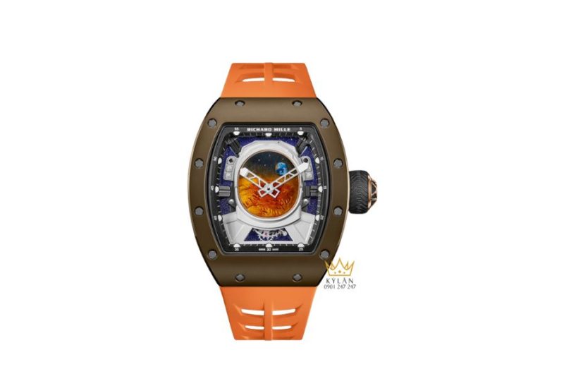 Richard Mille hoàn thiện RM 52-05 với dây cao su đặc trưng của hãng, mang sắc cam Sao Hỏa nổi bật. Màu sắc này không chỉ phù hợp với chủ đề hành tinh đỏ mà còn tạo sự tương phản mạnh với tông nâu của vỏ và xanh thẫm của mặt số, giúp tổng thể trở nên sống động và giàu cảm xúc.