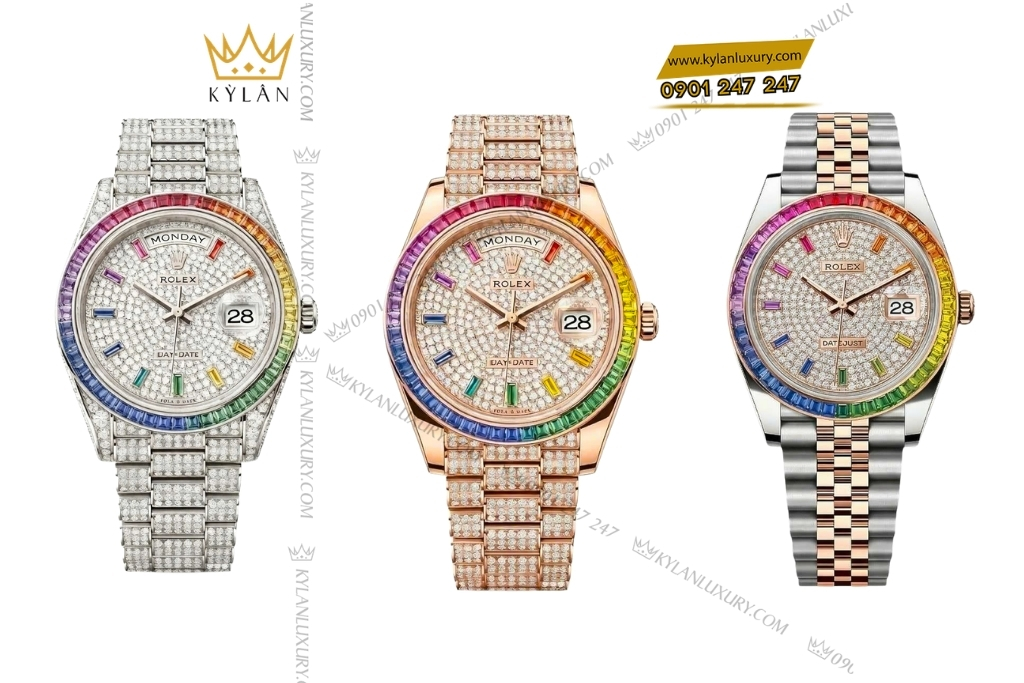 Bên trong vẫn là bộ máy Calibre 3255 chuẩn Rolex, đảm bảo hiệu suất và độ chính xác cao. Sự kết hợp giữa kỹ thuật và nghệ thuật nạm đá giúp mẫu Day-Date này trở thành tuyên ngôn đẳng cấp khác biệt.