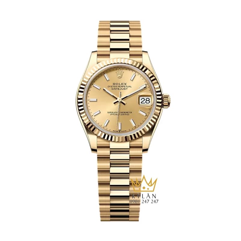 Sự hiện diện của Rolex Datejust 31 278278-0040 tại Kỳ Lân mang đến cơ hội để khách hàng trực tiếp cảm nhận vẻ đẹp của vàng 18ct, mặt số champagne cọc dạ quang và dây President danh giá trên cổ tay.