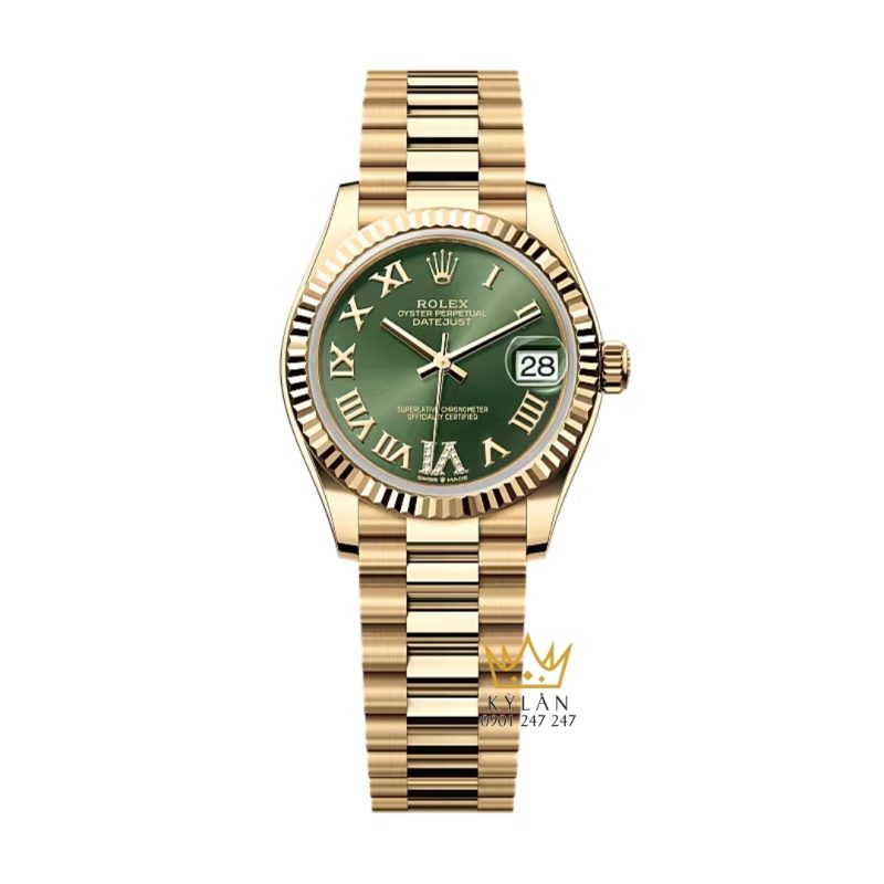 Sự hiện diện của Rolex Datejust 31 278278-0030 tại Kỳ Lân mang đến cơ hội để khách hàng trực tiếp cảm nhận vẻ đẹp của vàng 18ct, mặt số xanh olive nạm kim cương và dây President danh giá trên cổ tay.