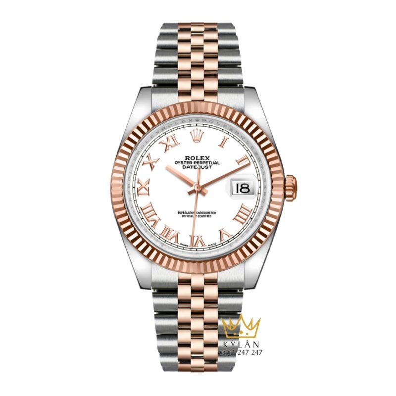 Mặt số trắng thanh lịch, cọc số La Mã vàng hồng nổi bật, bố cục cân đối, dễ quan sát và mang đậm phong cách cổ điển Rolex.