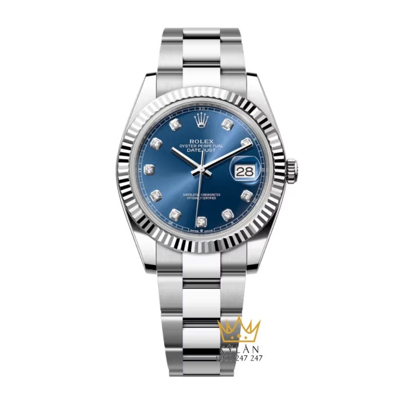 Phiên bản Rolex Datejust 41 126334-0015 nổi bật với kích thước 41mm cùng thiết kế White Rolesor (thép Oystersteel kết hợp vàng trắng 18K). Điểm nhấn nằm ở mặt số xanh dương đính kim cương, kết hợp vành bezel khía đặc trưng, mang đến diện mạo sang trọng, hiện đại và đầy cuốn hút.