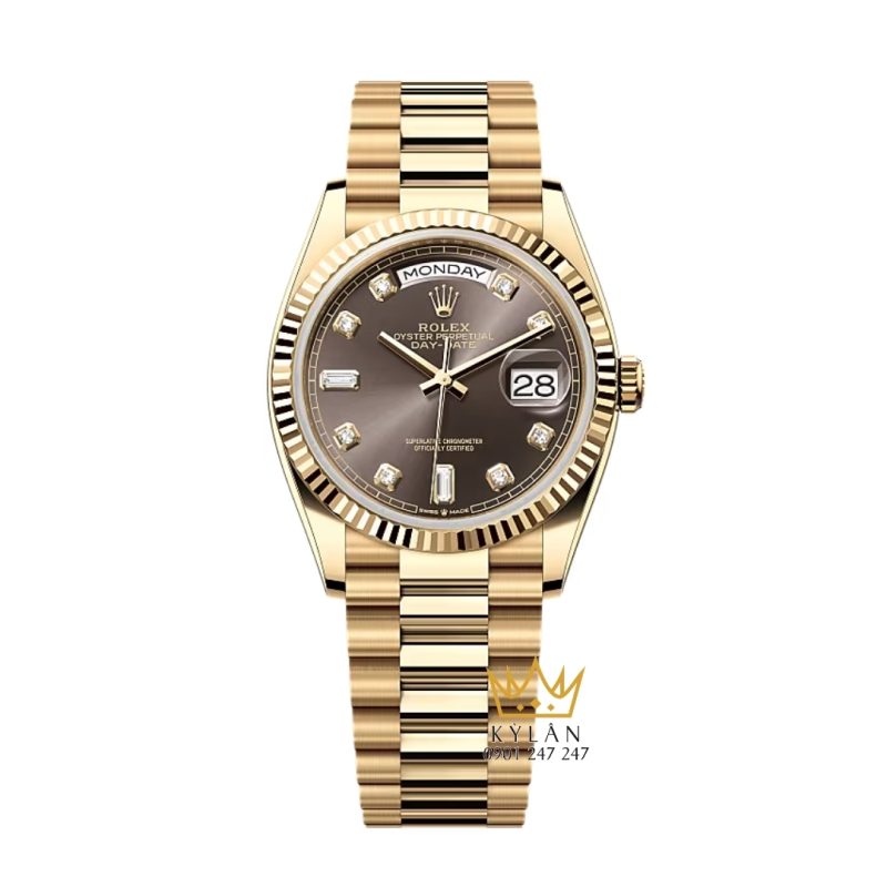 Sự hiện diện của Rolex Day Date 36 128238-0022 tại Kỳ Lân mang đến cơ hội để khách hàng trực tiếp cảm nhận vẻ đẹp hoàng kim của vàng 18ct, mặt số kim cương sang trọng và dây President danh giá trên cổ tay.