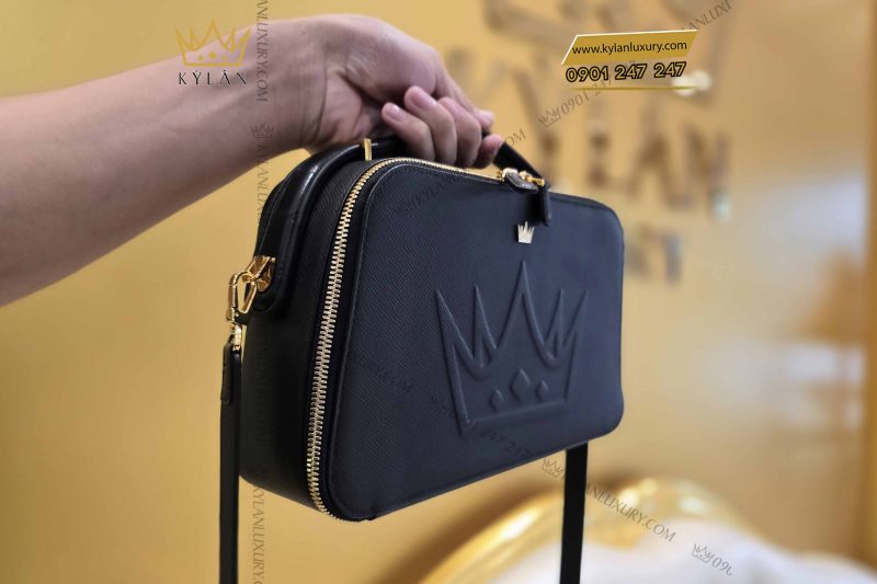 Mặt trước của túi nổi bật với biểu tượng vương miện dập chìm lớn, kết hợp cùng logo kim loại vương miện mạ vàng 18K nhỏ phía trên – tạo nên một tổng thể vừa quyền uy, vừa tinh tế. Đây là chi tiết nhận diện độc quyền của thương hiệu KyLan Luxury, gợi nhớ đến những biểu tượng hoàng gia, truyền cảm hứng về sự lãnh đạo và sang trọng.