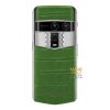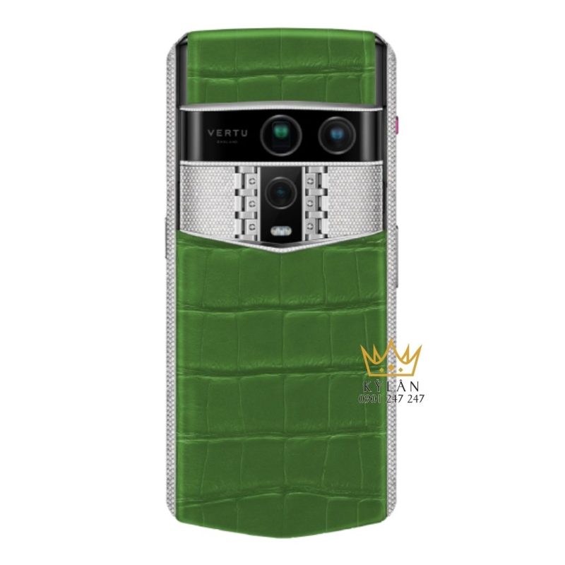 Mặt lưng được bọc da cá sấu Bamboo Green quý hiếm, được tuyển chọn kỹ lưỡng và hoàn thiện thủ công theo tiêu chuẩn khắt khe của Vertu, mang lại cảm giác cầm nắm mềm mại, sang trọng và thể hiện dấu ấn cá nhân độc đáo theo thời gian. Khung máy được chế tác từ hợp kim titan cao cấp, phủ ceramic màu bạc hiện đại. Toàn bộ bộ khung được gia công tỉ mỉ với kỹ thuật đánh bóng và chải xước tinh tế, tạo nên vẻ đẹp sang trọng cùng độ bền vượt trội.